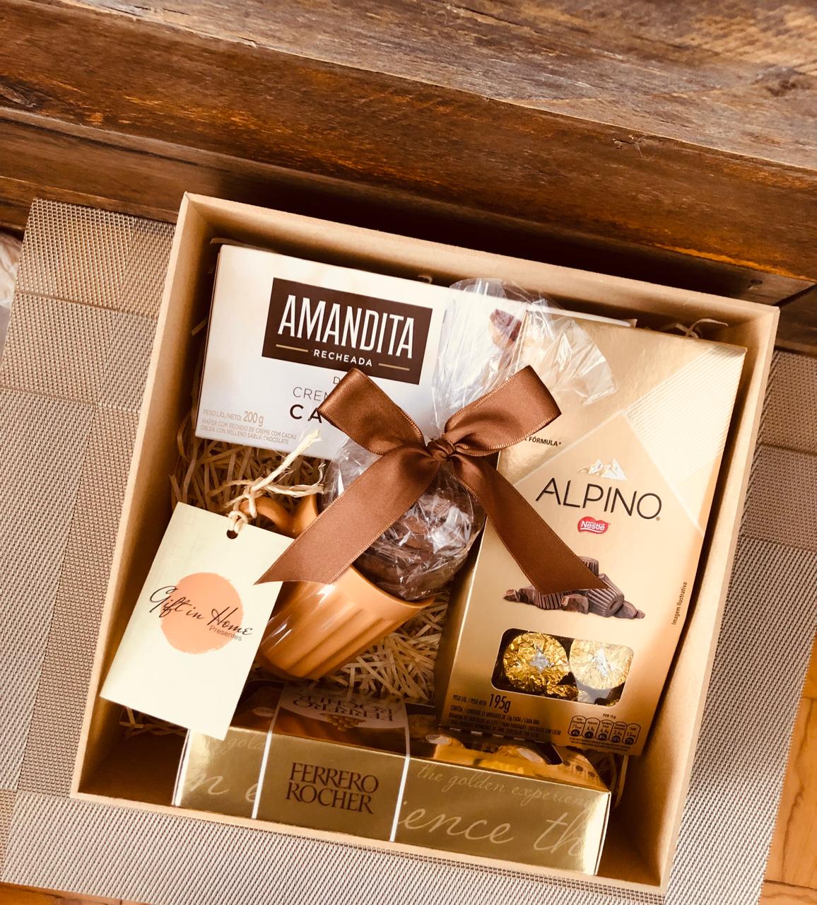 • 1 Caixa de Bombom Ferrero Rocher (100g): Bombons clássicos com camadas de wafer crocante, recheio de avelã e cobertura de chocolate ao leite.