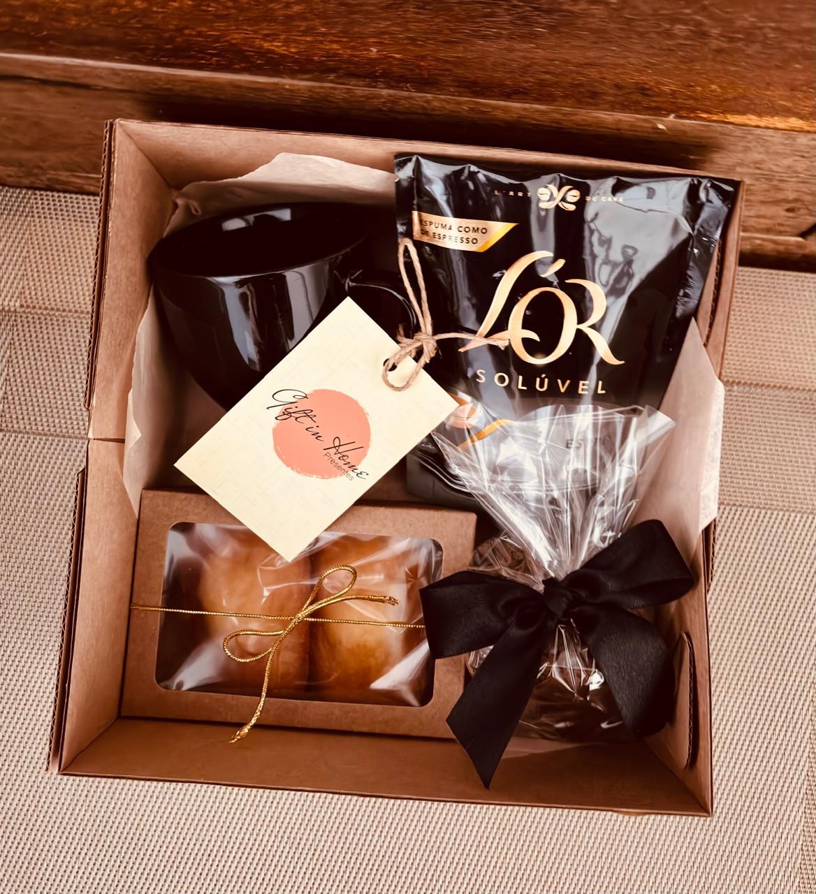 A Cesta Mimo Black Coffee foi criada para quem aprecia a intensidade e o ritual do café. Compacta, charmosa e cuidadosamente montada, ela transforma uma simples pausa em um momento especial de prazer e aconchego.
